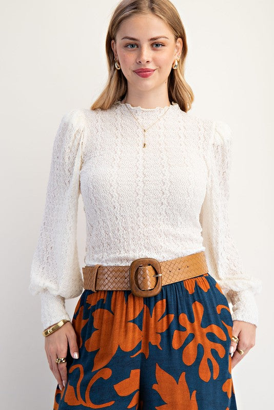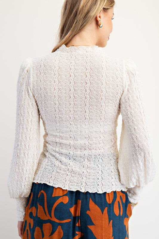 Embrace your free spirit with the Trouble Maker Top, featuring a textured lace design and a high neckline adorned with a delicate ruffle trim. Its fitted bodice and scalloped hemline highlight your silhouette, while slight puff shoulders and full-length bishop sleeves with elastic cuffs add a whimsical, bohemian flair. Perfect for those who love vintage-inspired, flowy styles with a modern twist.