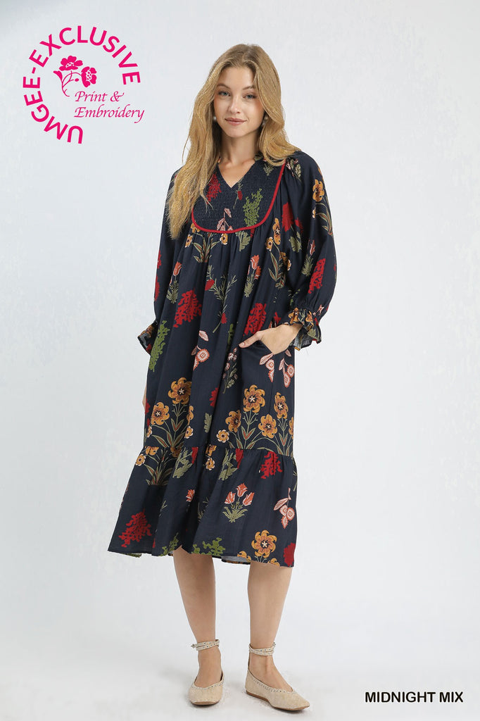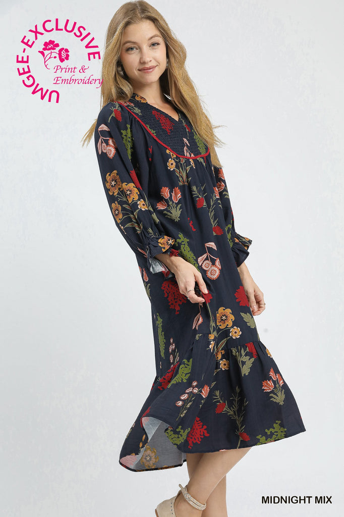 The Autumn Wildflowers Dress is a playful take on classic florals, featuring a smocked yoke and a round neckline that adds charming detail. Long sleeves with elastic ruffle cuffs pair perfectly with a tiered ruffle hem, creating a flowy silhouette that moves with you. Finished with contrast trim and a soft lining, this dress blends comfort and style for effortless, breezy days.