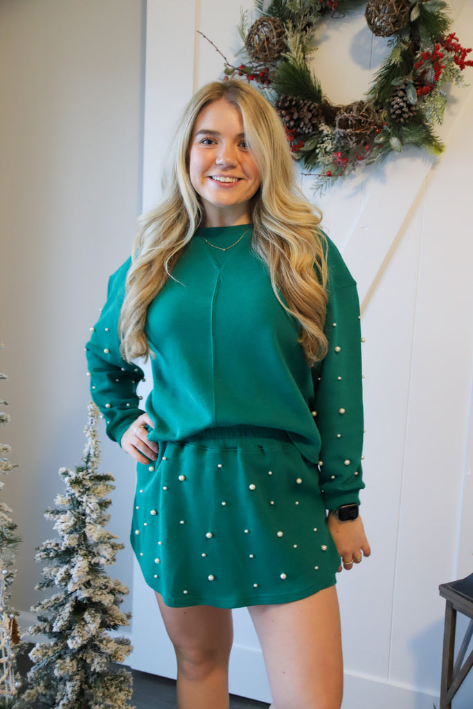 Add a touch of charm to your casual look with the Coming Into The Season Skort. This heavy knit skort boast a comfy elastic waistband and delicate pearl accents that bring a playful sparkle to your everyday style. Perfect for lounging or sunny strolls, they combine comfort and a bit of fun flair for your seasonal wardrobe. Matching top available.