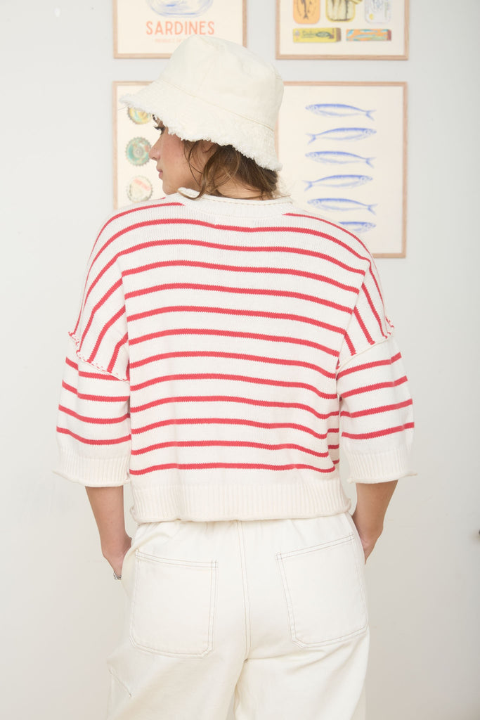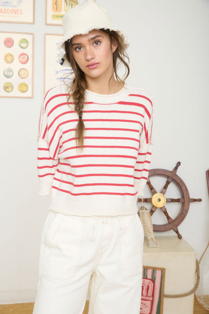 Wear your heart on your sleeve—literally. This striped sweater brings effortless cool with its relaxed drop shoulders and gently rolling hem that adds a touch of undone charm. The round neckline keeps things classic while the loose fit lets you move freely, whether you're conquering the day or just vibing. Perfect for layering or going solo, it's the kind of piece that makes getting dressed feel like fun.
