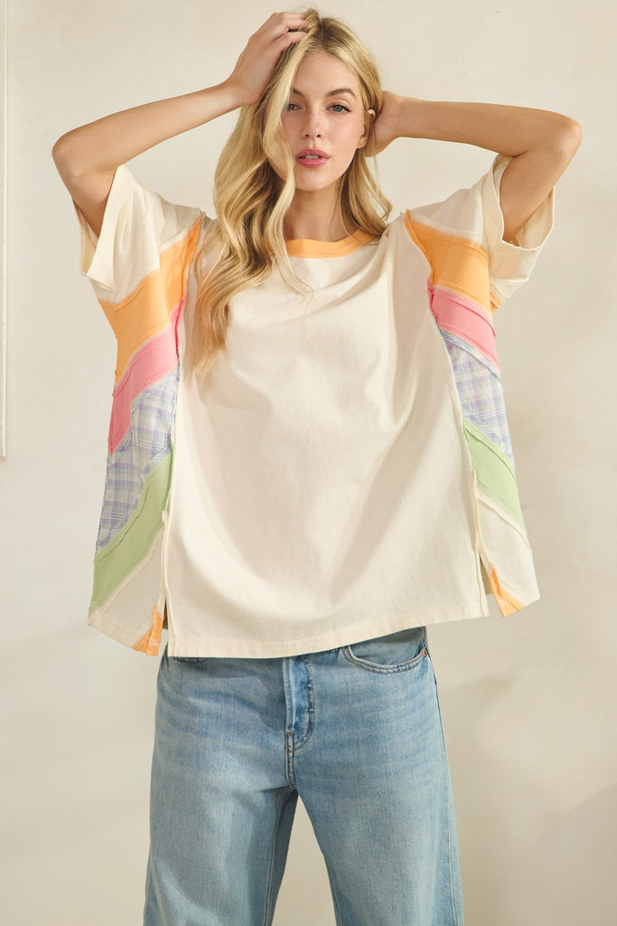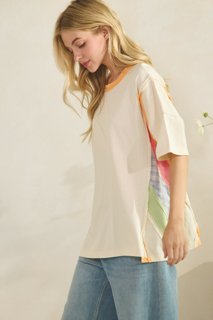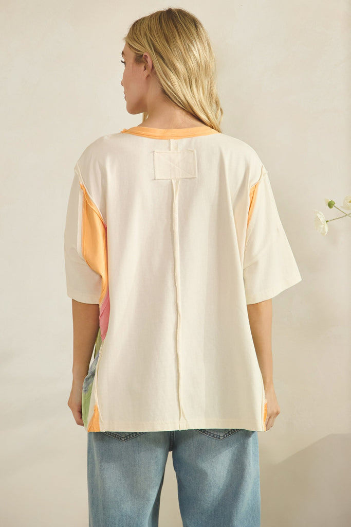 Embrace effortless style with the Vegas Sunset Top, a colorblock oversized tee that brings warmth and dimension to your everyday wardrobe. Crafted from soft, lightweight cotton-blend fabric, this relaxed, boxy fit offers all-day comfort without compromise. The solid front pairs beautifully with contrast panel patchwork on the sides, creating visual interest and movement. Finished with a crew neckline trimmed in contrasting color and short sleeves for comfortable coverage, this piece transitions seamlessly from casual outings to laid-back weekends.