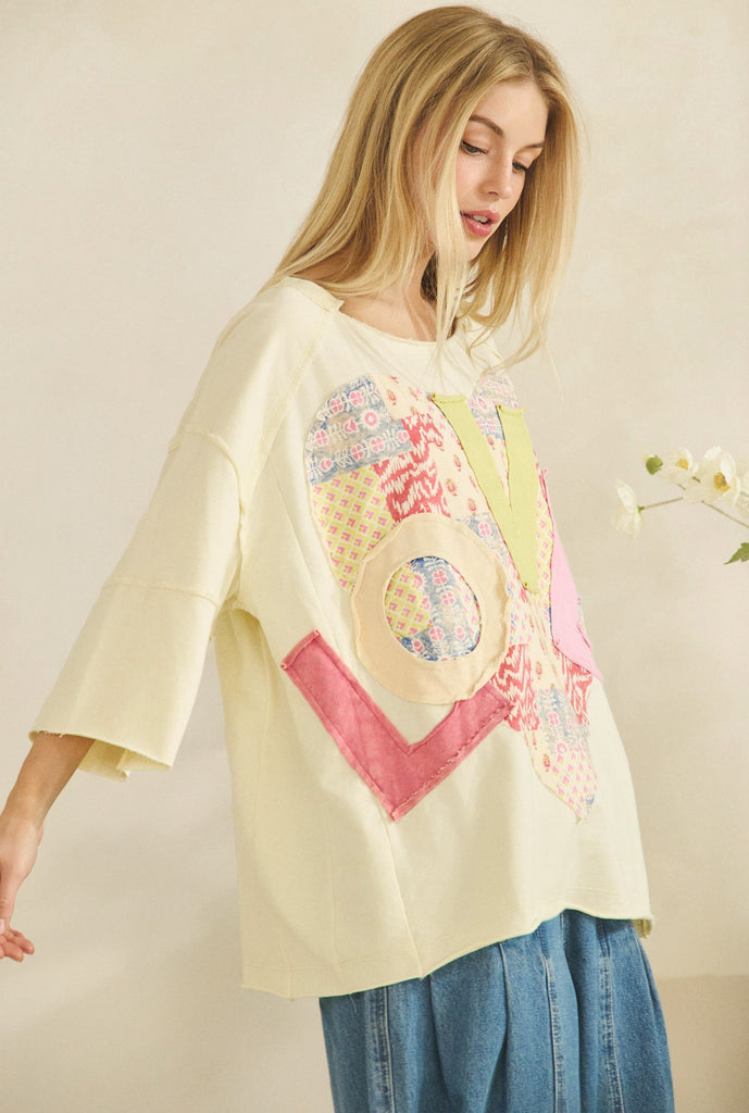 Embrace effortless style with this oversized love heart patchwork tee. Crafted on a soft mineral wash base, it features a bold heart-shaped applique made from mixed fabric scraps in vibrant prints. Raw edge detailing adds an intentional, artisanal touch, while the boxy silhouette and drop shoulders deliver that coveted relaxed fit. Finished with a classic crew neckline—perfect for layering or wearing solo.